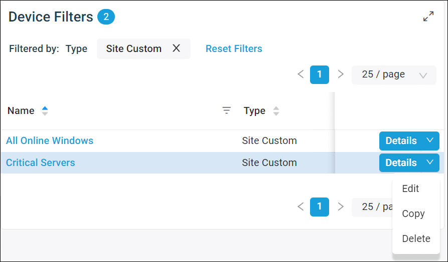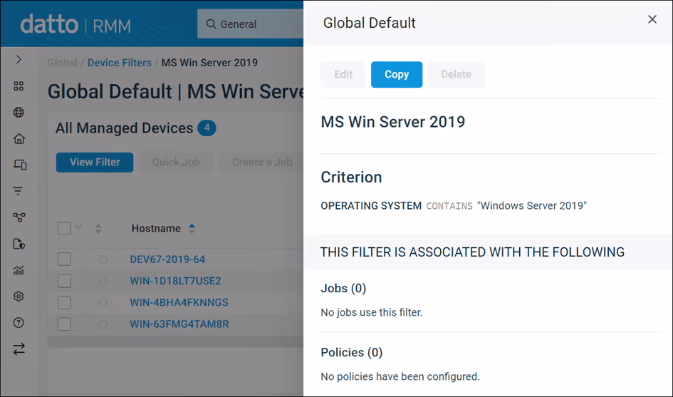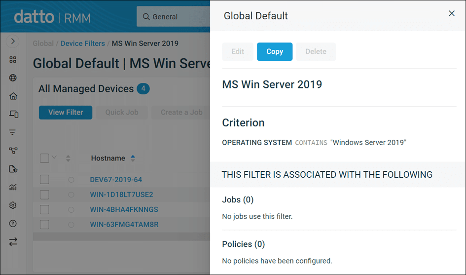 Vous pouvez désormais copier un filtre à partir des listes de filtres et du panneau de détail des filtres dans la nouvelle interface utilisateur afin de minimiser les répétitions lorsque de nombreux filtres similaires sont nécessaires avec des modifications mineures des critères. Pour en savoir plus, reportez-vous à la section « Afficher les détails d'un filtre » ou « Copier un filtre » dans l’aide de Datto RMM.
