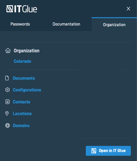 Onglet Organization : Les Deep Links ouvriront IT Glue pour un accès supplémentaire à des domaines tels que les contacts, les emplacements (Locations) ou les réseaux.