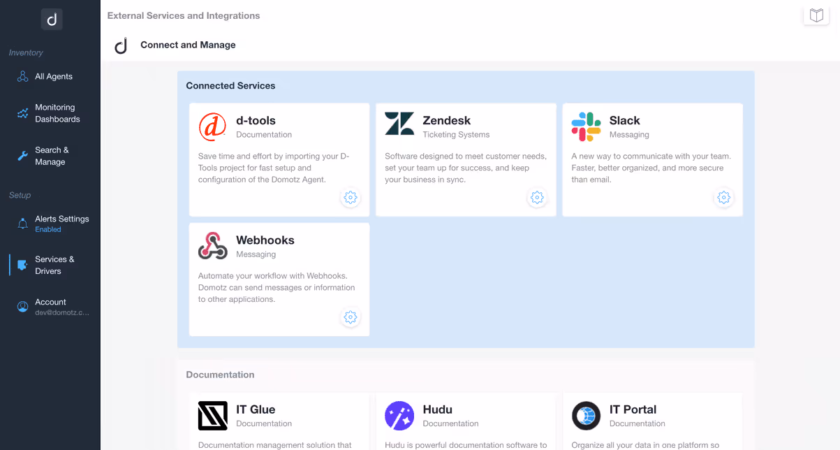 Documentez et suivez les périphériques en temps réel avec vos outils préférés : un PSA, comme Autotask PSA, de documentation informatique, comme IT Glue ou Liongard ou de productivité, comme Slack ou Microsoft Teams.