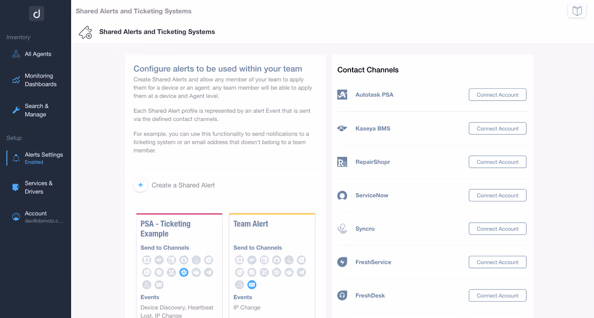 Help your team monitor device status, services and attributes across a variety of channels, including PSA Tools, Ticketing Platforms and messaging systems.