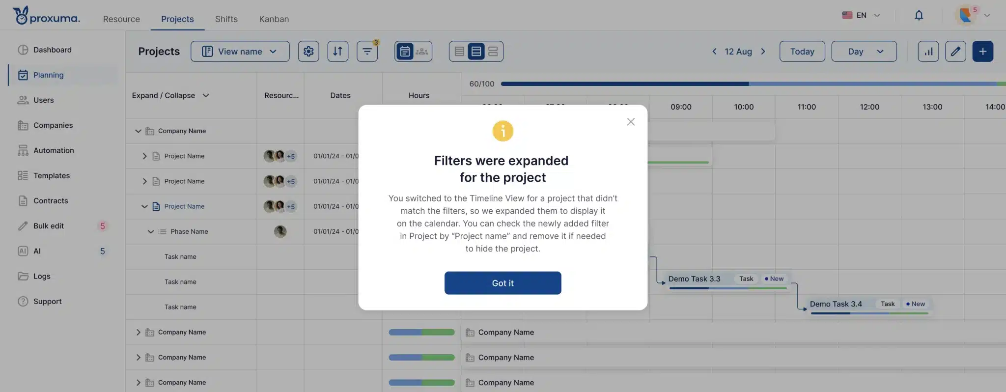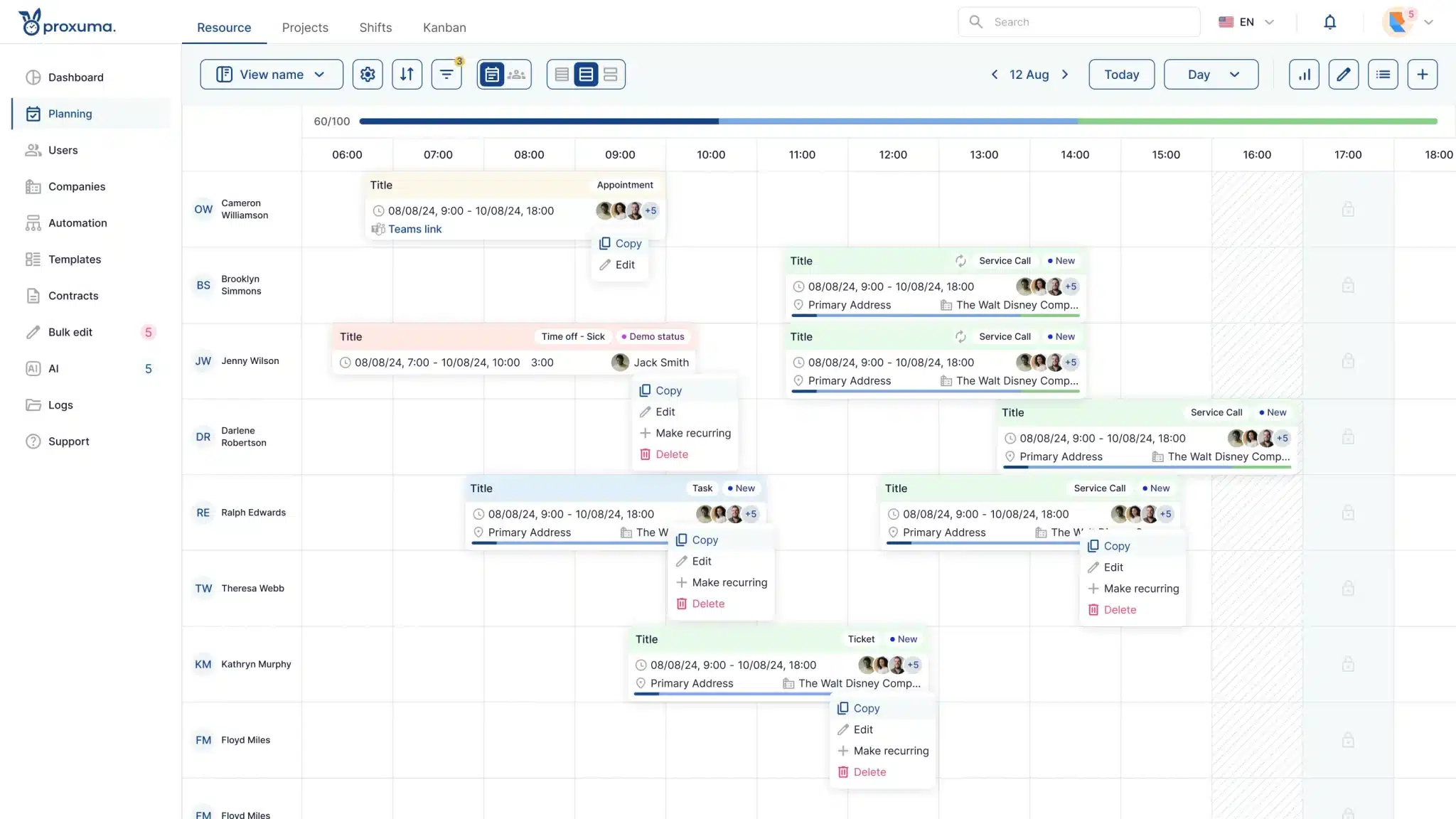 Grâce à la modification groupée, vous pouvez déplacer plusieurs tâches ou projets d’un coup. Proxuma gère automatiquement les appels de service associés et résout les conflits d’agenda.
